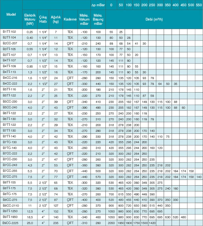 The table below shows the flow rate provided by different blower models according to different motor powers.