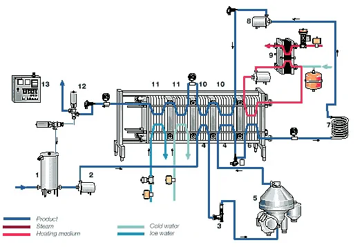 Plate pasteurizers consist of a series of plates. There are high-temperature resistant gaskets between the plates. These gaskets prevent the liquids passing through the plates from mixing. The plates are made of stainless steel with a thickness of 95-125 mm. The grooves on the plate create turbulent filling, increase the heat transfer surface and extend the liquid's heat contact time.